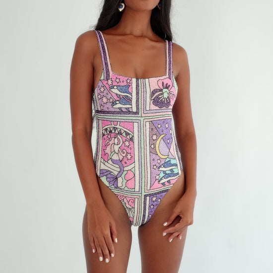 Stand out in the Talia Hand-Beaded Crystal Swimsuit, a true statement piece in luxury swimwear. Handcrafted by skilled artisans, each one-piece takes a day to complete with multi-coloured crystal beadwork. A versatile swimsuit that doubles as glamorous beachwear or styled with jeans for chic evening resortwear.